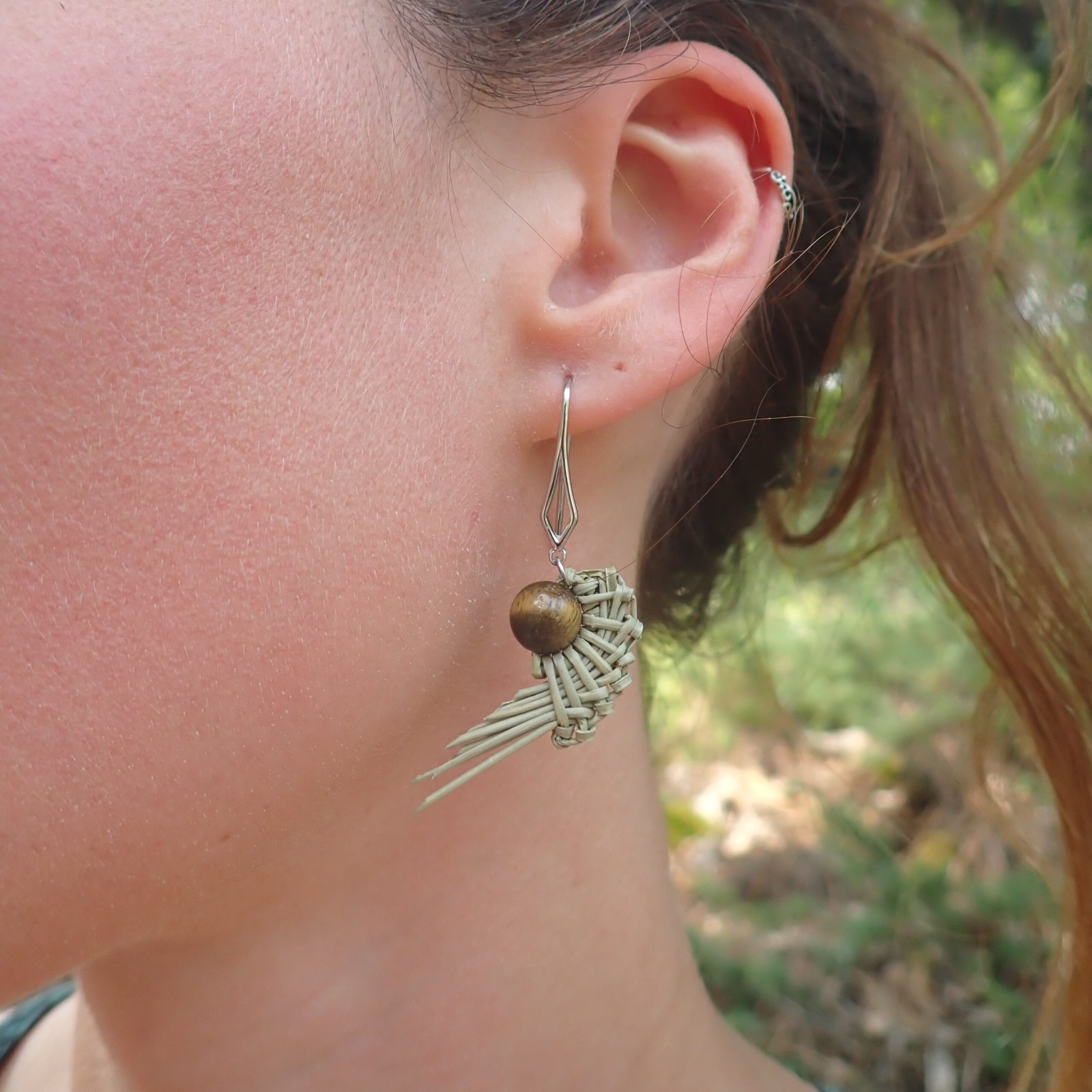 This pair of earrings is handwoven with Laricio pine needles, using a pattern known as the “lace knot.”