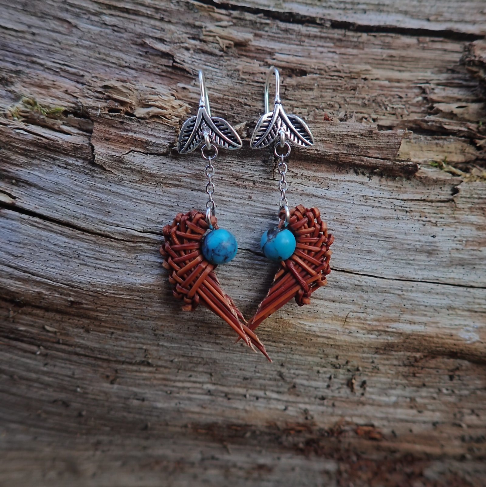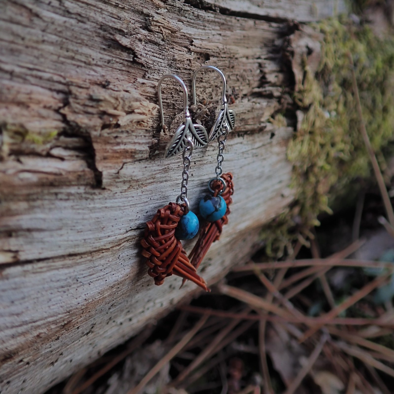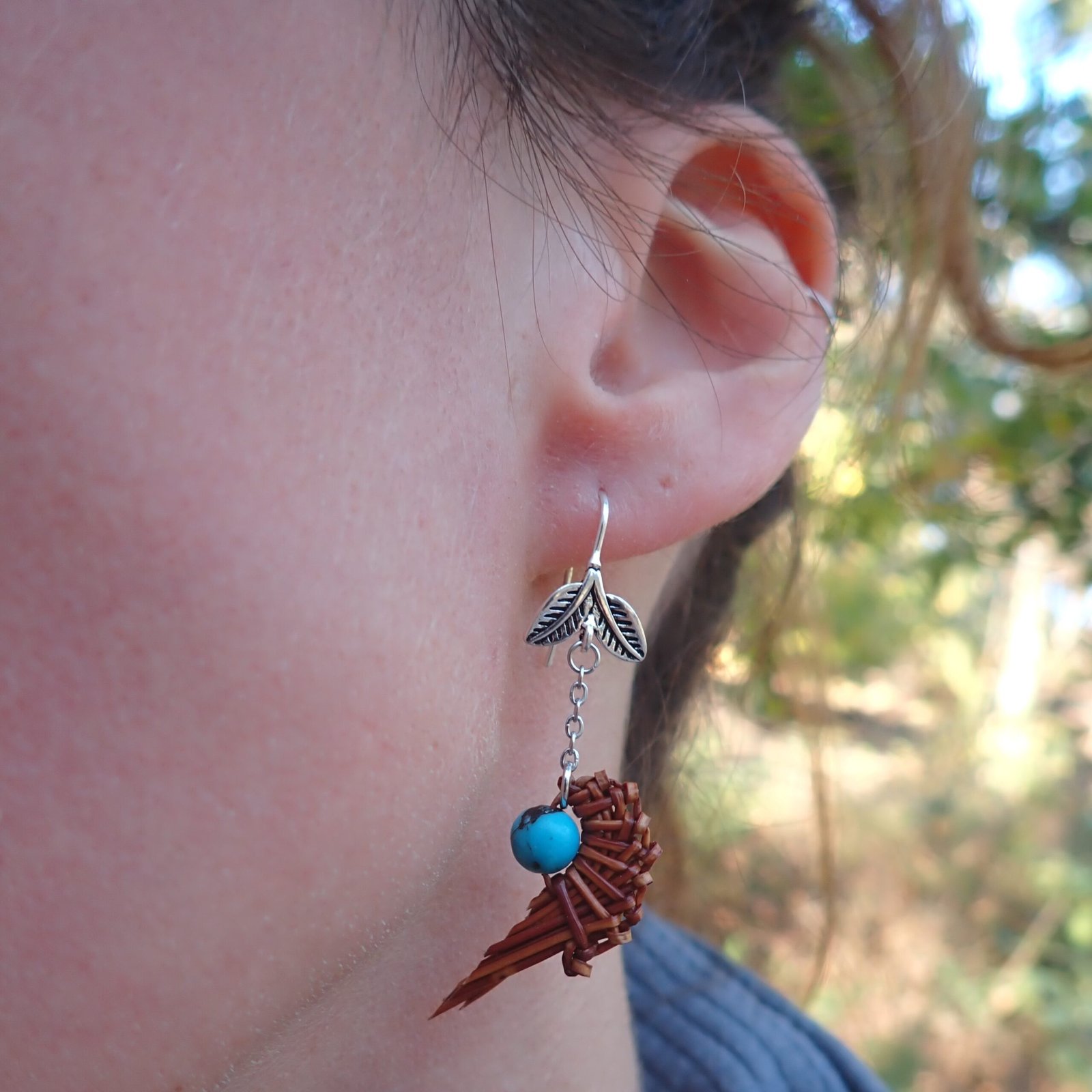 Cette paire est tressée autour d’une pierre naturelle de turquoise, avec des aiguilles de pin récoltées à l’automne pour leurs teintes rougeoyantes.