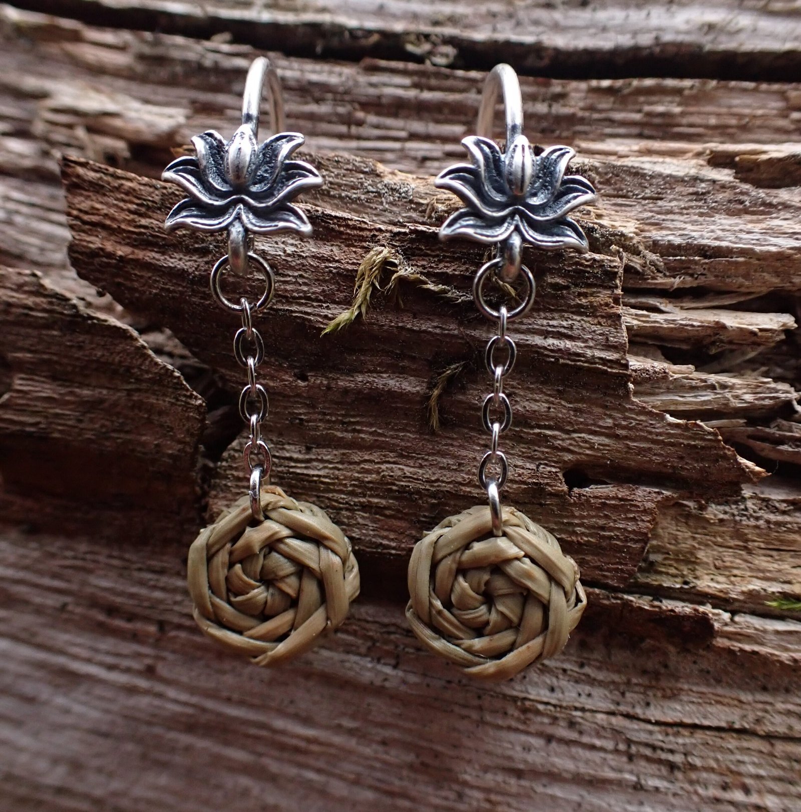Très légères, ces boucles d’oreilles sont tressées à la main à partir de trois aiguilles de pin laricio.